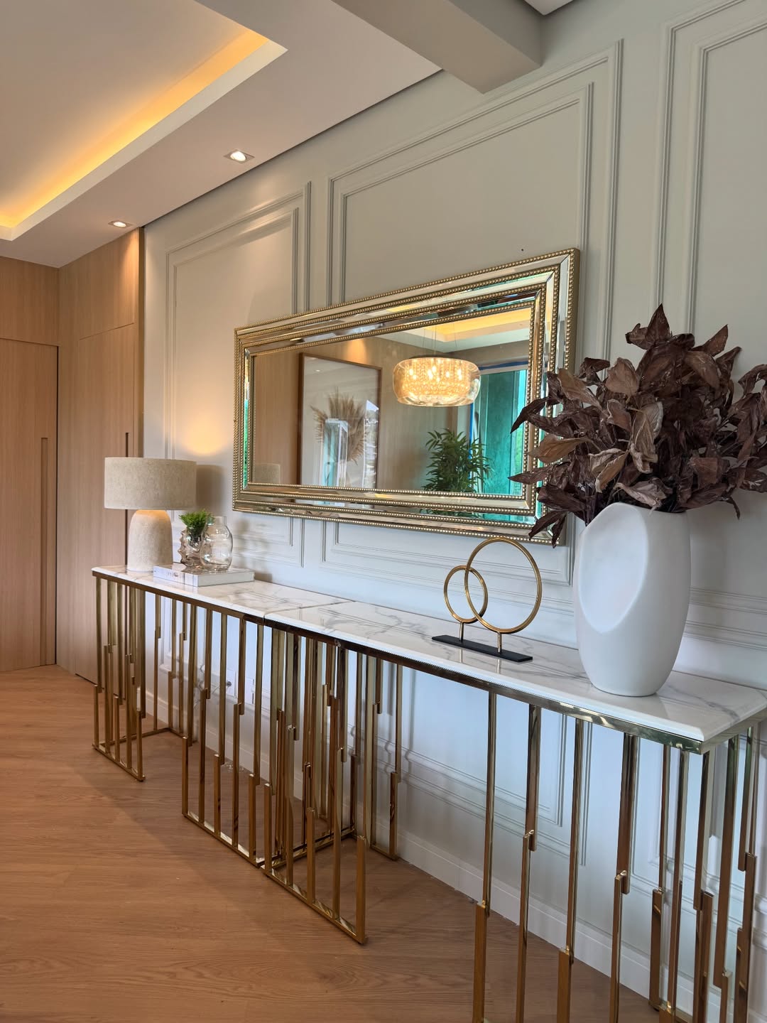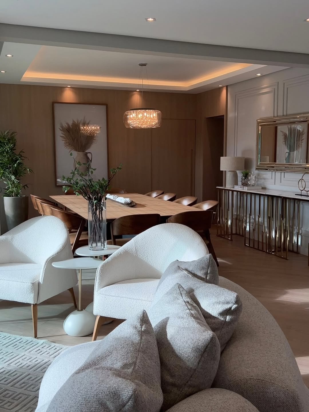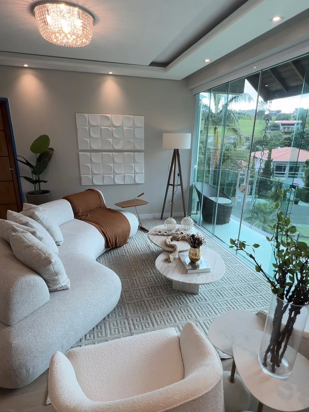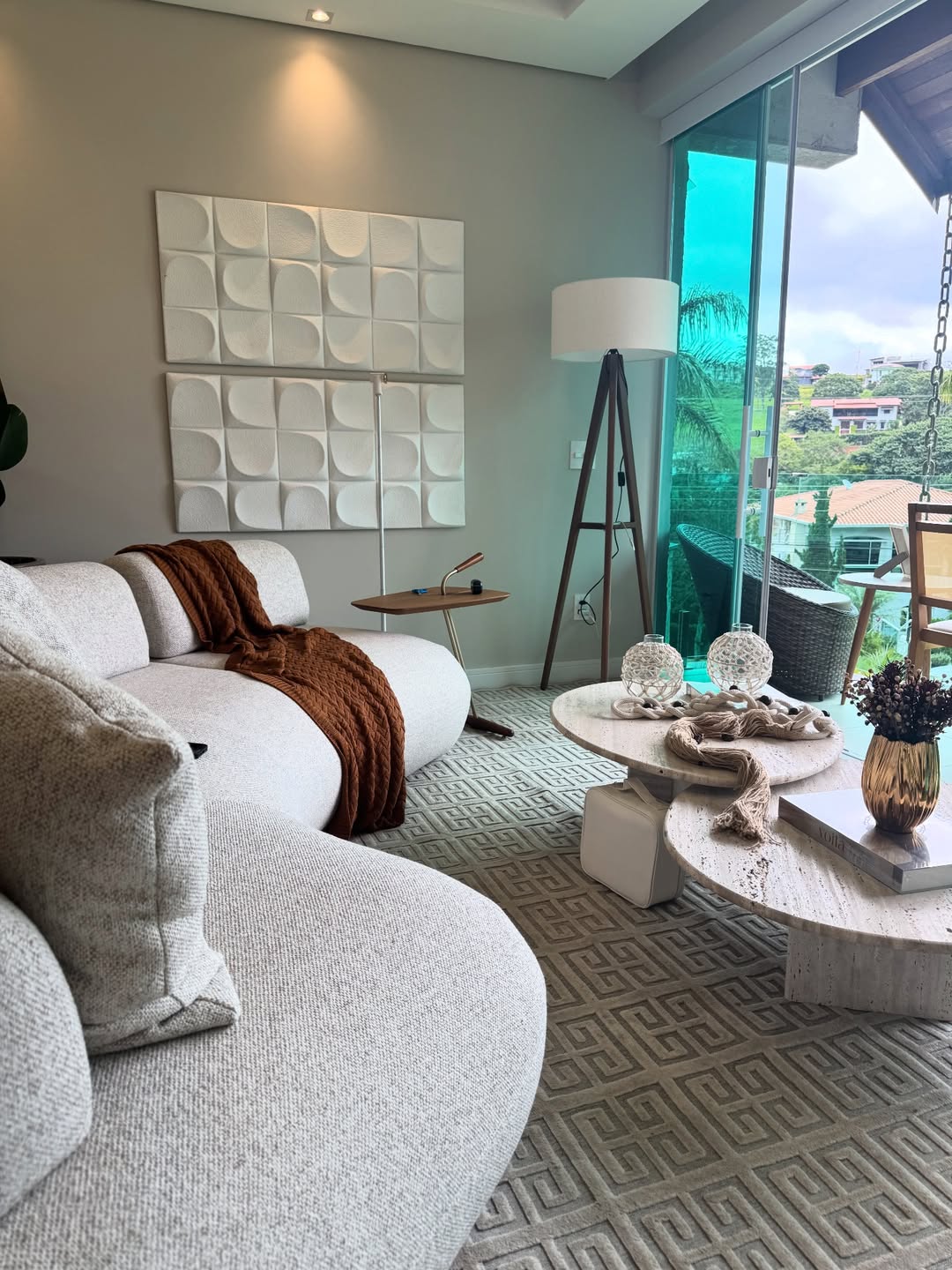 Nossa curadoria focou na serenidade, unindo rotina e leveza. A fluidez das linhas orgânicas do sofá, o detalhe em boiserie na parede e a paleta neutra valorizam a luz natural, enquanto o mármore travertino traz elegância atemporal.