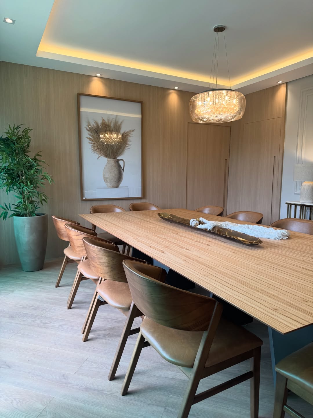 O ponto central é a imponente mesa de 12 lugares, um sonho realizado para a comunhão familiar. Mais que um projeto, criamos um cenário de memórias para celebrar a vida e os valores da família.